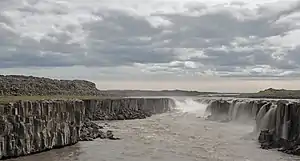 Selfoss (Icelandic pronunciation: [ˈsɛlˌfɔsː] ) is a waterfall on the river Jökulsá á Fjöllum in the north of Iceland. The river drops over a number of waterfalls over about 30 km before flowing into Öxarfjörður, a bay of the Arctic Sea. The river originates as melt water from the glacier Vatnajökull and therefore the water flow varies depending on the season, the weather and volcanic activity.[1]