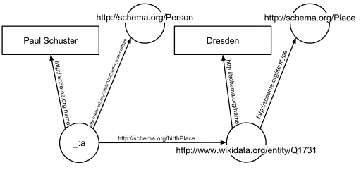 In the following example, the text "Paul Schuster was born in Dresden" on a website will be annotated, connecting a person with their place of birth. The following HTML fragment shows how a small graph is being described, in RDFa-syntax using a schema.org vocabulary and a Wikidata ID: