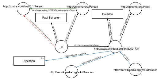One of the advantages of using Uniform Resource Identifiers (URIs) is that they can be dereferenced using the HTTP protocol. According to the so-called Linked Open Data principles, such a dereferenced URI should result in a document that offers further data about the given URI. In this example, all URIs, both for edges and nodes (e.g. http://schema.org/Person, http://schema.org/birthPlace, http://www.wikidata.org/entity/Q1731) can be dereferenced and will result in further RDF graphs, describing the URI, e.g. that Dresden is a city in Germany, or that a person, in the sense of that URI, can be fictional.