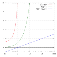 The linear–log type of a semi-log graph, defined by a logarithmic scale on the x axis, and a linear scale on the y axis. Plotted lines are: y = 10x (red), y = x (green), y = log(x) (blue).