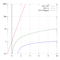 The log–linear type of a semi-log graph, defined by a logarithmic scale on the y-axis (vertical), and a linear scale on the x-axis (horizontal). Plotted lines are: y = 10x (red), y = x (green), y = log(x) (blue).