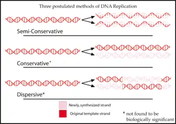 Semiconservative replication derives its name from the fact that this mechanism of transcription was one of three models originally proposed[3][4]for DNA replication: