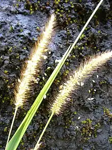 Setaria is a widespread genus of plants in the grass family.[5][6] The name is derived from the Latin word seta, meaning "bristle" or "hair", which refers to the bristly spikelets.[7]