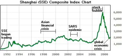 - 2007 – 2008 – A "stock market frenzy" as speculative traders rush into the market, making China's stock exchange temporarily the world's second largest in terms of turnover.[16][17] After reaching an all-time high of 6,124.044 points on October 16, 2007,[18] the benchmark Shanghai Composite Index ended 2008 down a record 65%[19] mainly due to the impact of the global economic crisis which started in mid-2008.