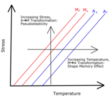 Here a load is isothermally applied to a SMA above the austenite finish temperature, Af, but below the martensite deformation temperature, Md. The figure above illustrates how this is possible, by relating the pseudoelastic stress-induced phase transformation to the shape memory effect temperature induced phase transformation. For a particular point on Af, it is possible to choose a point on the Ms line with a higher temperature, as long as that point Md also has a higher stress. The material initially exhibits typical elastic-plastic behavior for metals. However, once the material reaches the martensitic stress, the austenite will transform to martensite and detwin. As previously discussed, this detwinning is reversible when transforming back from martensite to austenite. If large stresses are applied, plastic behavior such as detwinning and slip of the martensite will initiate at sites such as grain boundaries or inclusions.[19][20] If the material is unloaded before plastic deformation occurs, it will revert to austenite once a critical stress for austenite is reached (σas). The material will recover nearly all strain that was induced from the structural change, and for some SMAs this can be strains greater than 10 percent.[21][22] This hysteresis loop shows the work done for each cycle of the material between states of small and large deformations, which is important for many applications.