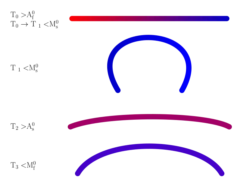 When a shape-memory alloy is in its cold state (below Mf), the metal can be bent or stretched and will hold those shapes until heated above the transition temperature. Upon heating, the shape changes to its original. When the metal cools again, it will retain the shape, until deformed again.