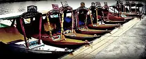 The shikara is a type of wooden boat found on Dal Lake and other water bodies of Srinagar in Jammu and Kashmir. Shikaras are of various sizes and are used for multiple purposes, including transportation. A usual shikara seats six people, with the driver paddling at the rear. Like the Venetian gondolas, they are a cultural symbol of Kashmir. Some shikaras are still used for fishing, harvesting aquatic vegetation (usually for fodder), and transport, while most are covered with tarpaulins and are used by tourists. A Shikara ride in Dal Lake is a great way to experience the beauty of Dal Lake and get a glimpse into the life of the locals.[1] Some are used as floating homes.[2][3]