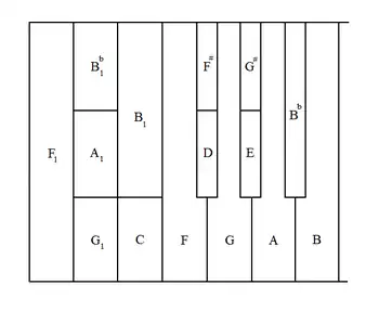 The assignment of notes to keys, which strikingly included a triple-split key, was as shown in the following diagram, adapted from Maunder (1998):