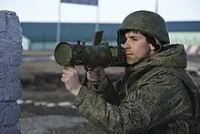 Russian soldier with a single-use disposable RPO-A Shmel rocket flamethrower.