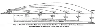 Trajectory and pattern of US 3-inch (76 mm) Shrapnel shell of WWI era.