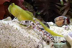 There are many variations in the ways different types of shrimp look and behave. Even within the core group of caridean shrimp, the small delicate Pederson's shrimp (above) looks and behaves quite unlike the large commercial pink shrimp or the snapping pistol shrimp.[12] The caridean family of pistol shrimp are characterized by big asymmetrical claws, the larger of which can produce a loud snapping sound. The family is diverse and worldwide in distribution, consisting of about 600 species.[22] Colonies of snapping shrimp are a major source of noise in the ocean and can interfere with sonar and underwater communication.[23][24][25] The small emperor shrimp has a symbiotic relationship with sea slugs and sea cucumbers, and may help keep them clear of ectoparasites.[26]