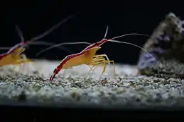 71 | Known as boxer shrimp, the members of this infraorder are often cleaner shrimp. Their third pair of walking legs (pereiopods) are greatly enlarged. The banded coral shrimp (pictured) is popular in aquariums. The Stenopodidea are a much smaller group than the Dendrobranchia and Caridea, and have no commercial importance.[41] | ||