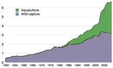 In the 1970s, significant shrimp farming was initiated, particularly in China. The farming accelerated during the 1980s as the quantity of shrimp demand exceeded the quantity supplied, and as excessive bycatch and threats to endangered sea turtles became associated with trawling for wild shrimp.[64] In 2007, the production of farmed shrimp exceeded the capture of wild shrimp.[59]