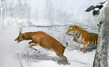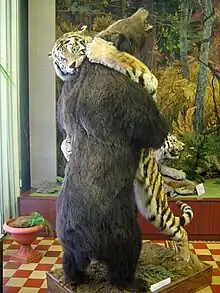 The effect the presence of tigers has on brown bear behavior seems to vary. In the winters of 1970–1973, Yudakov and Nikolaev recorded two cases of bears showing no fear of tigers and another case of a brown bear changing path upon crossing tiger tracks.[51] Other researchers have observed bears following tiger tracks to scavenge tiger kills and to potentially prey on tigers.[10][49] Despite the threat of predation, some brown bears actually benefit from the presence of tigers by appropriating tiger kills that the bears may not be able to successfully hunt themselves.[49] Brown bears generally prefer to contest the much smaller female tigers.[52] During telemetry research in the Sikhote-Alin Nature Reserve, 44 direct confrontations between bears and tigers were observed, in which bears in general were killed in 22 cases, and tigers in 12 cases.[53] There are reports of brown bears specifically targeting Amur leopards and tigers to abstract their prey. In the Sikhote-Alin reserve, 35% of tiger kills were stolen by bears, with tigers either departing entirely or leaving part of the kill for the bear.[54] Some studies show that bears frequently track down tigers to usurp their kills, with occasional fatal outcomes for the tiger. A report from 1973 describes twelve known cases of brown bears killing tigers, including adult males; in all cases the tigers were subsequently eaten by the bears.[55][56]