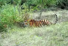 Siberian tigers are known to travel up to 1,000 km (620 mi) over ecologically unbroken country.[10] In 1992 and 1993, the maximum total population density of the Sikhote-Alin tiger population was estimated at 0.62 tigers in 100 km2 (39 sq mi). The maximum adult population estimated in 1993 reached 0.3 tigers in 100 km2 (39 sq mi), with a sex ratio of averaging 2.4 females per male. These density values were much lower than what had been reported for other subspecies at the time.[43] In 2004, dramatic changes in land tenure, population density, and reproductive output in the core area of the Sikhote-Alin Zapovednik Siberian Tiger Project were detected, suggesting that when tigers are well protected from human-induced mortality for long periods, the adult female population density increases significantly. When more adult females survived, the mothers shared their home ranges with their daughters once the daughters reached maturity. By 2007, population density of tigers was estimated at 0.8±0.4 tigers in 100 km2 (39 sq mi) in the southern part of Sikhote-Alin Zapovednik, and 0.6±0.3 tigers in 100 km2 (39 sq mi) in the central part of the protected area.[44]