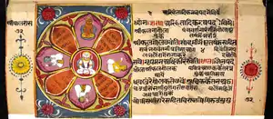 Navapada is the core of the lotus.[15] Navapada includes five supreme beings having virtues, Guni or Panch Parmeshthi, and four right virtues, Gunas according to Svetambara tradition. Their attributes are described in 108 scriptures.[1][2][3][4][14] They are also illustrated in silver or copper plates for worship.[6][16] In the Digambara tradition, it has the same Panch Parmeshthi but the other four elements are different.[8]
