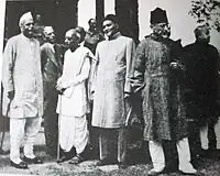 Simla Conference: Left to Right: Lord Wavell (Viceroy of India), Tara Singh, Mr Jinnah, Hussain Imam, Pandit Shukla (CM C.P.), Sir Ghulam Hussain Hidayatullah (CM Sindh)