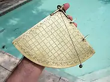 A sine quadrant (Arabic: الربع المجيب, romanized: rub‘ul mujayyab), sometimes known as a "sinecal quadrant", was a type of quadrant used by medieval Arabic astronomers. The instrument could be used to measure celestial angles, tell time, find directions, perform trigonometric computations, and determine the apparent positions of any celestial object for any time. The name is derived from the Arabic rub meaning 'a quarter' and mujayyab meaning 'marked with sine'.[1]