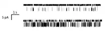 Two examples of data (~10 s each) from a single-channel recording experiment using the patch clamp technique. The upper trace is at a lower concentration, while the lower trace is recorded at an agonist concentration near this ion channel's EC50. Channel openings are represented by downward deflections, in this case deflections of approximately 5 pA.