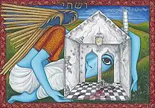 Siona Benjamin (Kasukar) is originally from Bombay, now living in the New York City area.[2] Her signature work as a multicultural artist reflects her background of being brought up Jewish in a predominantly Hindu and Muslim in India.[2] In her paintings, she combines the imagery of her past with the role she plays in America today, making a mosaic of underlying meaning inspired by both Indian miniature paintings and Sephardic icons. She has her first MFA in painting and a second MFA in Theater set design.[3][4] She has exhibited in the US, Canada, Europe, India, and Asia.[5]