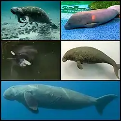 | Clockwise from upper left: West Indian manatee, African manatee, Steller's sea cow, dugong, Amazonian manatee | |