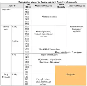 The Slab-Grave culture is an archaeological culture of Late Bronze Age and Early Iron Age Mongolia.[3][4] The Slab-Grave culture formed one of the primary ancestral components of the Xiongnu, as revealed by genetic evidence. The ethnogenesis of Turkic peoples and the modern Mongolian people is, at least partially, linked to the Slab-Grave culture by historical and archaeological evidence.[5][6][7] and further corroborated by genetic research on the Slab Grave remains.[8][9]