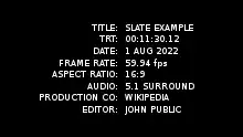 In broadcasting, a slate is a title card listing important metadata of a television program, included before the first frame of the program. The broadcasting equivalent of a film leader, the slate is usually accompanied with color bars and tone, a countdown, and a 2-pop.[1][2] In videotape workflows, slates help ensure that the tape received is the right one to broadcast (or to project, in the case of digital cinema) or to ingest into a digital playout system. It also provides helpful context for consideration in the re-editing of the material into a larger package.[3] A convention from the videotape era of television broadcasting, the need for slates in a tapeless workflow has largely been usurped by the Material Exchange Format.[4] However, the slate is still a regular and often-required fixture of television stations and other media companies as of 2023.[5]