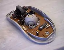 The slotted optical switch, sometimes known as opto switch or optical switch but not to be confused with the optical component, is a device comprising a photoemitter (e.g. LED) and a photodetector (e.g. photodiode) mounted in a single package so that the photoemitter normally illuminates the photodetector, but an opaque object can be inserted in a slot between them so as to break the beam. Associated circuitry is provided which changes state when the beam is interrupted. For example, the carriage of a computer printer may be fitted with a projection which interrupts the beam of a slotted switch when it reaches the end of its travel, causing circuitry to react appropriately. Another application of the slotted switch is in the type of computer mouse with a rotating ball. The ball measures distances moved by rotating orthogonal shafts which drive optical chopper wheels turning in the slots of slotted switches.[1]