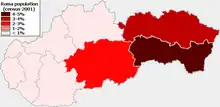 According to the last census from 2021, there were 67,179 persons counted as Romani people in Slovakia, or 1.23% of the population.[1] However, the number of Roma is usually underreported, with estimates placing the Roma population at 7-11% of the population. Thus the actual number of Roma may be over half a million.[2]
