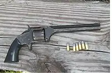 Smith & Wesson Model No. 2 .32 Rimfire Revolver made in 1865. It came to Texas in 1871 the property of J. E. Henry Cumpston B. circa 1830 Ireland d. 1916. Blooming Grove, Texas.
