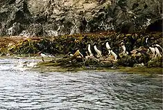 Snares penguins nest in dense colonies under the tree cover of the Olearia forests or on coastal rocks.[6] To build a nest, the penguins dig up shallow holes in the ground and layer the bottom with grass, leaves, twigs, peat, or pebbles.[5] A small rim of mud is added to the rim of the nest to raise it above ground level.[3] Vegetation at nesting sites dies dues to the dense nesting activities, and the colony moves to a new nesting site.[7] Colonies nesting near streams may have some advantage, as the stream provides water for drinking and bathing. However, it is not essential that nesting colonies are located near a stream and many are far from any stream.[3]