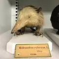 Traditionally, solenodons' closest relatives were considered to be the giant water shrew of Africa and Tenrecidae of Madagascar,[12] though they are now known to be more closely related to true shrews (Eulipotyphla).[8][13] Solenodons resemble very large shrews, and are often compared to them; with extremely elongated cartilaginous snouts, long, naked, scaly tails, hairless feet, and small eyes. The Cuban solenodon is generally smaller than its Hispaniolan counterpart. It is also a rusty brown with black on its throat and back. The Hispaniolan solenodon is a darker brown with yellowish tint to the face.[14] The snout is flexible and, in the Hispaniolan solenodon, actually has a ball-and-socket joint at the base to increase its mobility. This allows the animal to investigate narrow crevices where potential prey may be hiding.