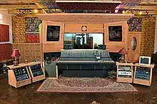 The Stone Room is a five-sided room made of travertine stone, with a slanted latia ceiling which optimizes acoustic diffusion.[9][10] When stripped of baffles and carpets, it serves as an echo chamber during mixdown. The center tracking room, leading to the Drum Room, has carpets and absorbable material between the traditional vigas in the ceiling structure which shortens the decay time in the room and makes it suitable for vocals and electric guitar tracking.