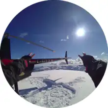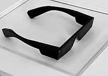 The original version of the glasses included a camera lens with a 115° field of view (110° on V2) and records in a circular format that adapts to a smartphone's screen size and orientation.[28] The smartglasses record when the user presses a button on the top left of its frame, for a maximum of 30 seconds (in 10 second intervals).[28] They sync with its designated smartphone via Bluetooth and Wi-Fi.[29] The camera also houses a ring of LED lights that indicates battery level and when they are recording. The pair of glasses charge in a yellow case that has a built-in battery and connects to its proprietary cable.[30] The cable can be attached either to the case or directly to the glasses. According to the manufacturer, the fully charged case will hold enough power to recharge the glasses four times.[31] The lithium-ion batteries in both the case and the glasses draw power from a standard 5 volt USB power supply, and connect via a USB cable which is held in place by small magnets.[32]
