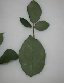 A wide variety of rose species are susceptible to powdery mildew. In light of this it is more practical to discuss the rose varieties that are resistant as opposed to those that are susceptible. Two varieties that have been found to show resistance to rose powdery mildew are "Paul's Pink" rose variety and the "Magic" rose variety.[3] Other research has shown that many chestnut rose (Rosa roxburghii) varieties are also resistant to powdery mildew. Rosa sterilis, Rosa kweichowensis, Rosa laevigata, Rosa lucidissima, and Rosa chinensis have all been shown to be resistant to powdery mildew. R. multiflora var. multiflora and R. multiflora var. cathayensis have all been shown to be susceptible to rose powdery mildew.[4] Symptoms caused by the rose powdery mildew can be a dwarfing of the growth of the plant, or the twisting and deforming of leaves,[5] but more noticeable is a sign of the disease, which is the white condia, the “powder” that appears on the plant surfaces, such as leaves, shoots, flowers, and buds.[1] The fungus may grow on both new and old leaves, but is generally more concentrated on the underside of the leaf.[6]