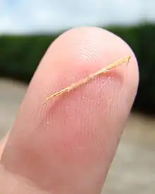 Splinters commonly consist of wood, but there are many other types, for example, other common types of splinters are, hair, glass, plastic, metal, and spines of animals.[2]