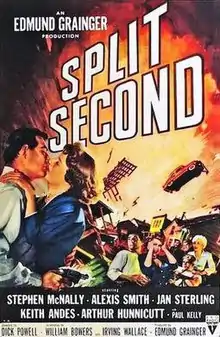 Split Second is a 1953 American film noir thriller directed by Dick Powell about escaped convicts and their hostages holed up in a ghost town, unaware of the grave danger they are in. It features Stephen McNally, Alexis Smith, Jan Sterling, and Keith Andes.[2] It was the only film put into production by the consortium that took over RKO Pictures in late 1952 before previous owner Howard Hughes resumed control of the company.[3] Location shooting took place in the Mojave Desert.