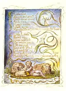 William Blake's Songs of Innocence (1789) is a lyric anthology that consists of nineteen illuminated poems. Each poem is accompanied with an illustration by Blake. Songs of Innocence was later combined with Blake's Songs of Experience in 1794 to make Songs of Innocence and Experience, and were printed combined as well as separately.[1]