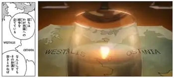 Map of Westalis and Ostania in the manga (left) and the anime (right). Note the strong similarity with the divided geography of Germany during the Cold War.