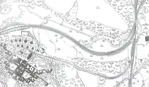 From the platform at Leek Brook, the tramway swung to the right alongside the exchange sidings from the NSR. Railway engines were not allowed further than these sidings under the various agreements between the NSR (and its successor the London, Midland and Scottish Railway[7] and also because being lightly built the tramway could not take the weight of railway locomotives.[5] Past the sidings the line climbed steeply with a maximum gradient of 1:16.6 (6%) being encountered.[4] The line then proceeded by way of a switchback arrangement to terminate at the rear of the main hospital building.