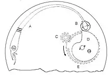 See drawing, right. The stackfreed consists of a stiff spring arm (A) with a roller at the end (B) which presses against an eccentric cam (D);[4][2][7] usually the roller rides in a groove in the cam's edge. The cam is shaped like a snail. It has a gear on it (E) that is turned by a gear on the mainspring arbor (C), so it makes one turn during the clock's running period. The force of the spring arm against the cam exerts a retarding force on the mainspring, reducing its torque, which varies with the thickness of the cam. When the mainspring is fully wound up, the arm presses against the wide part of the cam. Since it is far from the axis, the retarding force it exerts is maximum. As the clock runs and the mainspring unwinds, the cam rotates and the spring bears against the narrower parts of the cam, reducing the retarding force gradually, to compensate for the declining force of the mainspring.