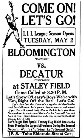 Staley Field was also used by the company baseball team during the summer months, and Halas also played on that team. The field was also used by the Decatur entry in the Three-I League in 1915 and 1922–23.[2]