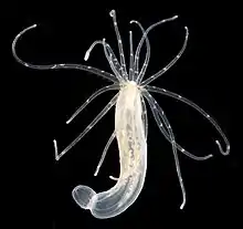 Researchers at the Sars International Centre for Marine Molecular Biology have found that genes concerned in the formation of the head in higher animals are also present in Nematostella vectensis. The larva swims with the end with its main sense organ in front, and at metamorphosis this end becomes the lower end of the column. The "head" gene is concerned in the development of this lower end rather than the oral crown and tentacles.[12][13]