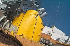 The MIT Museum maintains some historic displays on the ground floor of the Stata Center. A few selected larger relics of past hacks (student pranks) are now on semi-permanent display, including a "fire hose" drinking fountain, a giant slide rule, and full-size replicas of a cow and a police car that had been placed atop the Great Dome (though not at the same time). In the ground floor elevator lobby of the Dreyfoos Tower are located a large time capsule box plus informational panels describing MIT's historic Building 20, which the Stata Center has replaced.