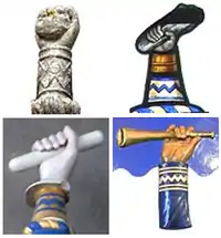 - ↑ As seen on framed mural monument in Exford Church, Somerset, to Major Morland Greig (1864–1915), of Edgcott, Exford, Master of the Devon & Somerset Staghounds, killed in action at Gallipoli. The badge is also shown, but with the hand grasping a palm frond, sculpted on the mural monument in the Church of St Giles in the Wood, Devon, to Captain John Oliver Clemson (1882–1915) of Stevenstone, also killed fighting with the same regiment at Gallipoli.