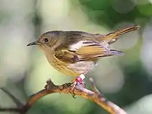 The stitchbird was originally described as a member of the primarily Australian and New Guinean honeyeater family Meliphagidae. It had remained classified as such until recently. Genetic analysis shows that it is not closely related to the honeyeaters and their allies and that its closest living relatives are within the endemic New Zealand Callaeidae.[5][6][7] In 2007 a new passerine family was erected to contain the stitchbird, the Notiomystidae.[6][8]