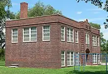 The building is constructed in a rectangular shape, symmetrical on the exterior, and measures 32 feet (9.8 m) by 66 feet (20 m). The approximate height measurements are not provided by the Register. Large, six over six paned windows are located in the front and the back of the building on both floors. Similar windows are also located on the south side of the building, but only on the top floor. There are no windows located on the north side. The entire exterior of the building is constructed from brick. The roof is flat and constructed of roofing cement, with a parapet located around it, with a section of a chimney that sticks out of the south end of the roof. The most prominent feature of the exterior of the building is the large, central pavilion, with a stepped gable parapet wall.[1]