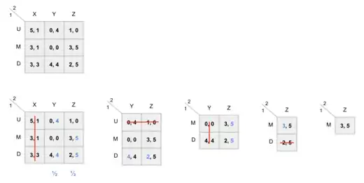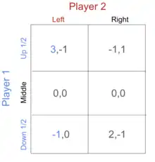 In this scenario, for player 1, there is no pure strategy that dominates another pure strategy. Let’s define the probability of player 1 playing up as p, and let p = ½. We can set a mixed strategy where player 1 plays up and down with probabilities (½,½). When player 2 plays left, then the payoff for player 1 playing the mixed strategy of up and down is 1, when player 2 plays right, the payoff for player 1 playing the mixed strategy is 0.5. Thus regardless of whether player 2 chooses left or right, player 1 gets more from playing this mixed strategy between up and down than if the player were to play the middle strategy. In this case, we should eliminate the middle strategy for player 1 since it’s been dominated by the mixed strategy of playing up and down with probability (½,½).