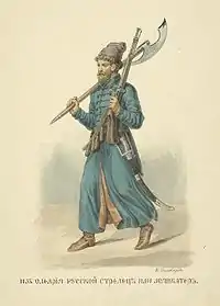 The streltsy (Russian: стрельцы, IPA: [strʲɪlʲˈt͡sɨ], lit. 'shooters/riflemen'; SG стрелец, strelets, IPA: [strʲɪˈlʲet͡s]) were the units of Russian firearm infantry from the 16th century to the early 18th century and also a social stratum, from which personnel for streltsy troops were traditionally recruited. They are also collectively known as streletskoye voysko (стрелецкое войско, riflemen army). These infantry troops reinforced feudal levy horsemen or pomestnoye voysko (поместное войско). The first units were established by Ivan the Terrible as part of the first standing army in Russia.[1]