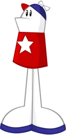 Homestar has a white head and a red t-shirt with a white star on it. He either wears long white pants that match his skin tone or no pants at all, and appears to have blue soles on the bottom of his bare feet. He wears a blue hat with a white propeller on the top and a red bill on his head. He lacks visible arms but is nevertheless able to manipulate objects, either through the use of invisible appendages or telekinesis.
